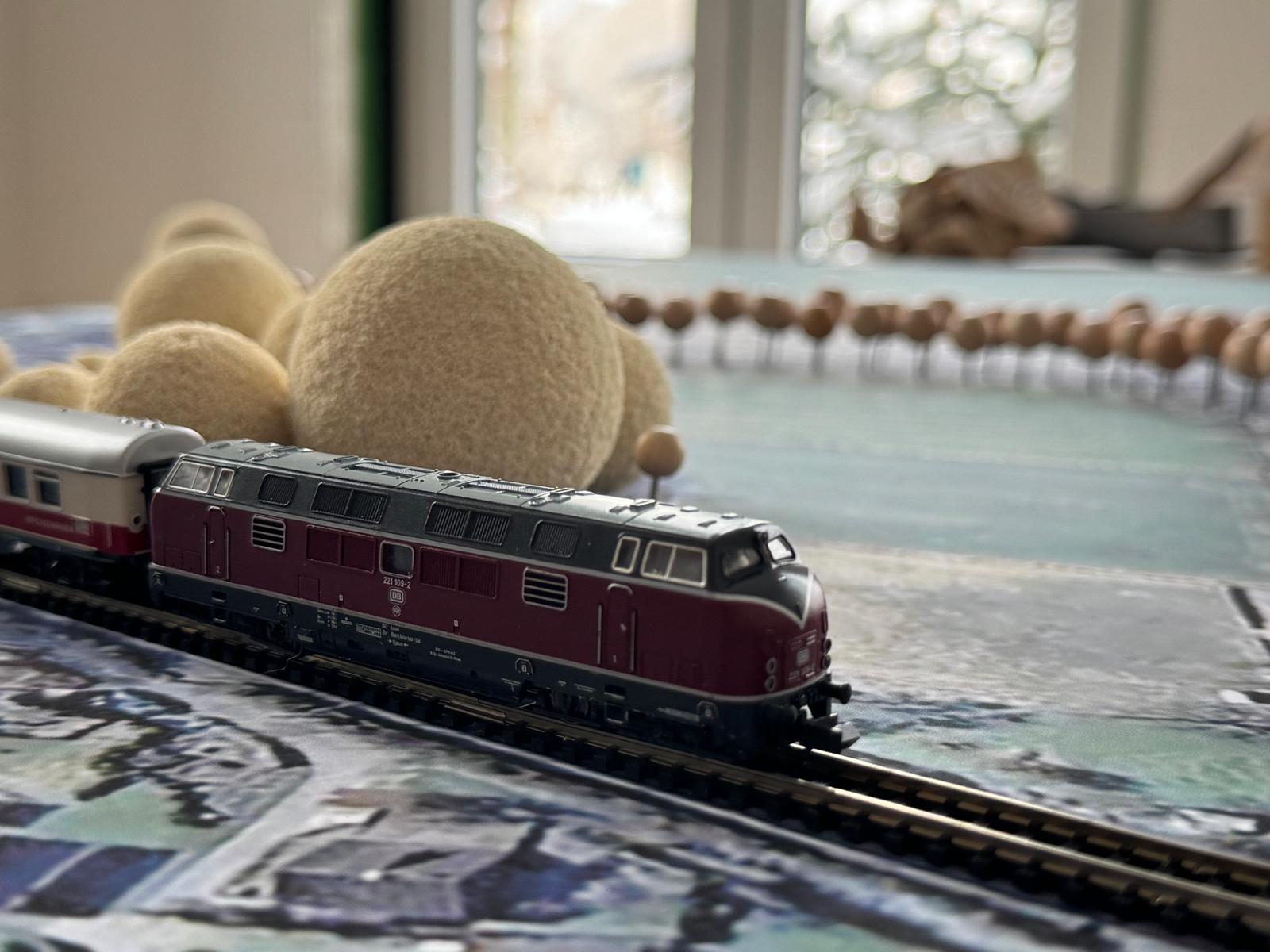 Wir haben einen aktuellen Plan von Krempe ausgeplottet und die Allee sowie die angrenzenden Gehölzstrukturen dreidimensional markiert. Die Kugeln aus Holz und Schaumstoff stehen für einzelne Bäume und Baumgruppen. Unterschiedliche Größen verdeutlichen Alter, Dichte und räumliche Struktur des Bestands.